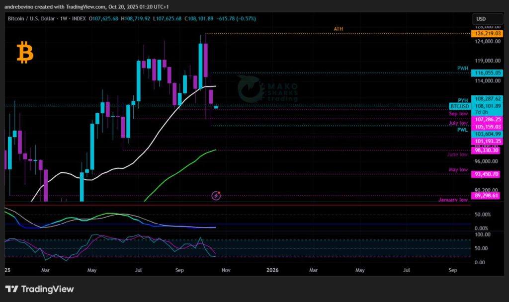 Още една тежка седмица за биковете и „Hopium“, тъй като Биткойн оформи ново Previous Week Low (PWL) на 103,6k и леко се плъзна под Previous Year High (PYH)/дневната 200EMA на 108,9k. Това, което би могло да донесе поне краткосрочен позитивен отговор за биковете, е успешно възстановяване и дневно затваряне над 200EMA/PYH 108,9k, което би могло да създаде условия за пауза и потенциален отскок към седмичната 21SMA 112,7k или дори към Previous Week High (PWH) 116k.
