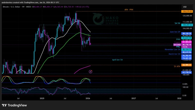 Мечките си търкат ръце, докато Назгулите кръжат над криптосферата. Седмичната 55EMA на 96,1k отхвърли Bitcoin и беше потвърдена като съпротива, последвана от търговия под месечната 21SMA на 88,9k и годишното отваряне на 87,4k, и изглежда, че е само въпрос на време, преди ниското ниво от 80,6 хиляди долара от 24 ноември да бъде тествано – ниво, което в момента изглежда като тънък лед, разделящ Bitcoin от зоната между 70 и 75 хиляди долара, където може да се появи следващата значима възходяща реакция и опит за отскок. Мисията на мечките остава непроменена: да осигурят успешно дневно затваряне под нивото от 80,6 хиляди долара, достигнато на 24 ноември, което ефективно би отворило вратите на Мордор. В идеалния случай за мечките оставането под нивото от началото на годината от 87,4 хиляди долара и месечната 21SMA от 88,9 хиляди долара остава ключово, докато задържането под PWH от 93,6 хиляди долара на дневна база би трябвало да е достатъчно само по себе си. 😎 😈 😇