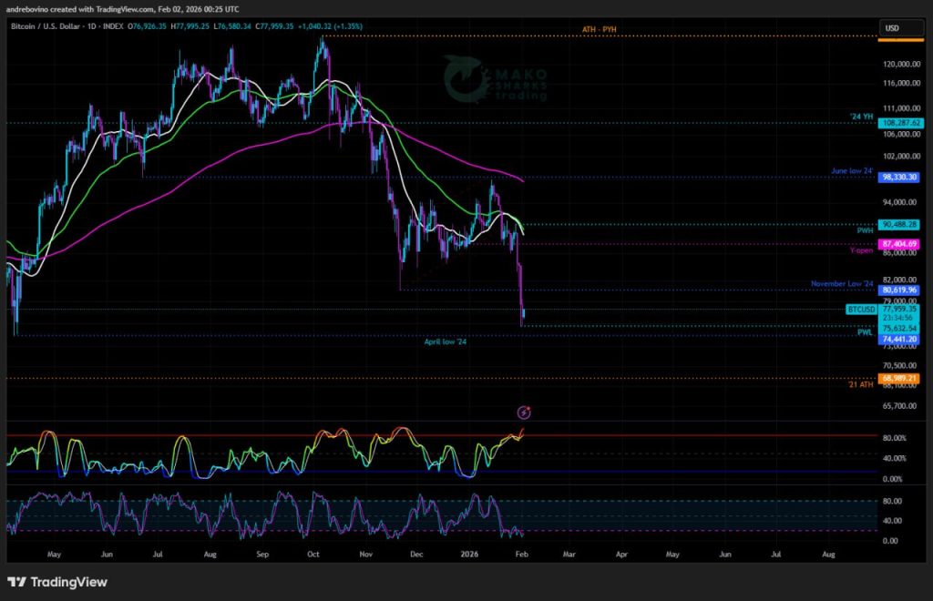 С течение на времето Bitcoin се движи „все по-навътре в Мордор“, докато мечките и Назгулите премахват подкрепа след подкрепа, зона след зона. Мисията „Ноемврийско дъно ’24 на 80,6k“ е изпълнена, а новата краткосрочна мисия за мечките е да премахнат априлското дъно ’24 на 74,4k. Кратка консолидация с потенциално леко отскачане е много вероятна, преди да се премине към по-ниско ниво към седмичната 200EMA 68,4k и '21 ATH 68,9k, която действа като макро подкрепа, която все още трябва да се докаже в следващите седмици. Наред с тази нова мисия, за мечките е идеално да останат под месечната 21SMA 88,9k и годишното отваряне на дневна база, а всяко успешно дневно затваряне под седмичната 200EMA 68,4k много вероятно ще тласне Bitcoin към месечната 55EMA 63,2k някъде в долната зона от 60k. 👼 😎 😈