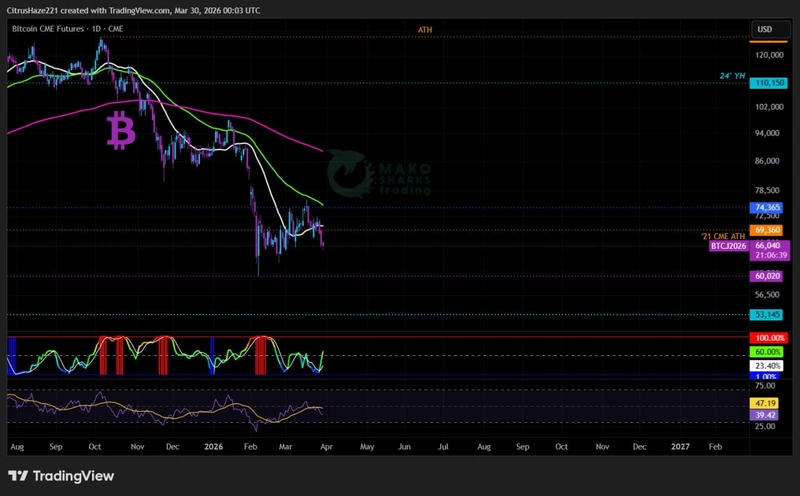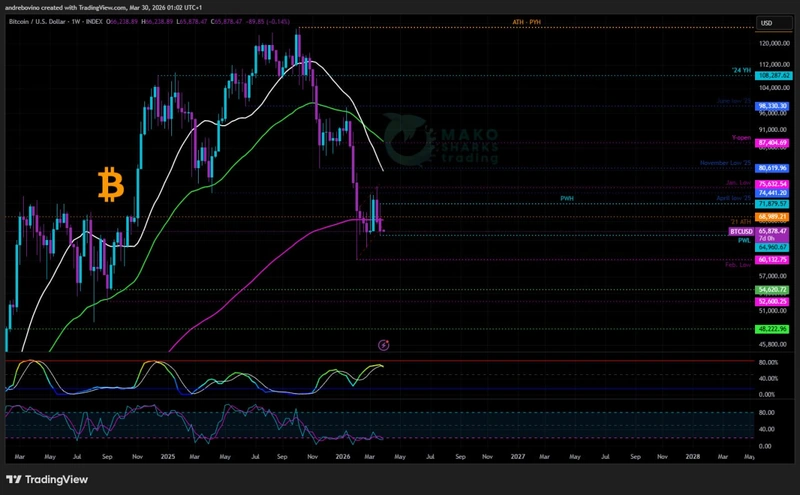 Биковете все още не могат да намерят начин да запалят „хопиума“ до месечното затваряне! Единственото нещо, което може да помогне на биковете тази седмица, е успешното възстановяване на седмичната 200-периодна пълзяща средна (200EMA) на 68,2k и дневната 21-периодна пълзяща средна (21SMA) на 70k и 55-периодната пълзяща средна (55EMA) на 71,8k. Казвам „единственото нещо“, защото шансовете за отбрана на февруарското дъно от 60,1k са мъртвородени… Успешното възстановяване на дневните „MA линии“, последвано от успешно дневно затваряне над върха от предходната седмица (PWH) 71,8k, може потенциално да отвори вратата за предизвикателство към седмичната 21SMA на 79,9k, но при настоящото състояние на нещата това е по-малко вероятно от текущата зона, но валидни цели след много вероятно спадане в зоната на 50k. 🤬 🟢⚰️