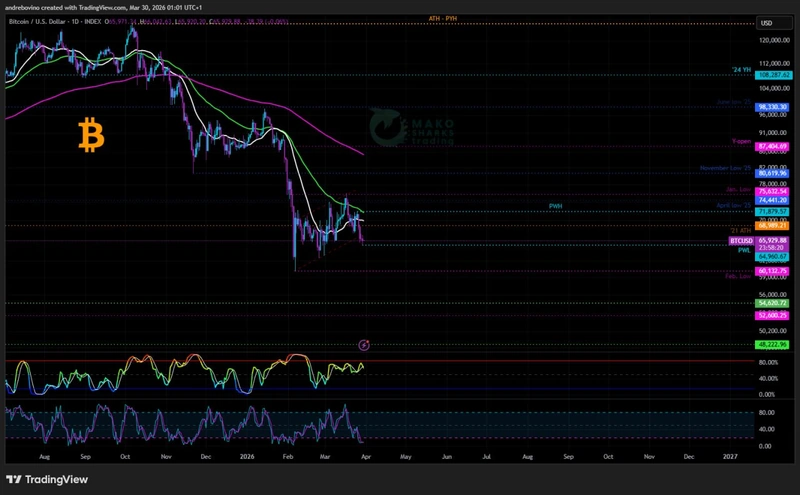 Биткойн започва седмицата на ниво 65,9 хил.! С наближаването на края на месеца натискът за продажби става все по-силен, което се вижда от неотдавнашния пробив на мечия флаг и загубата на ключовите линии на пълзящата средна, които доскоро оказваха подкрепа! Нова низходяща вълна става все по-вероятна и биковете нямат много място, нито време да намерят кремък или кибритена клечка, за да запалят „хопиума“ и да продължат да търсят „отскок на мъртва котка“! През април може да се очаква колебливо поведение, което потенциално би могло да възроди старата крипто поговорка „продай през май и си тръгни“! 😇 🌊 🦄