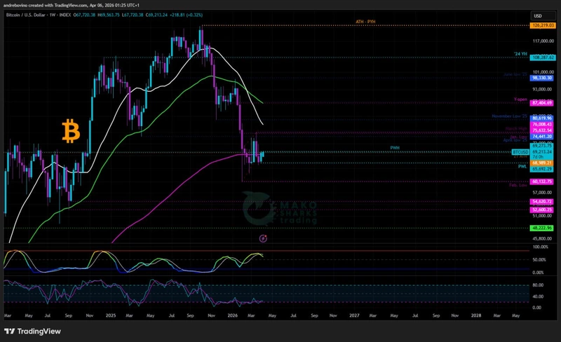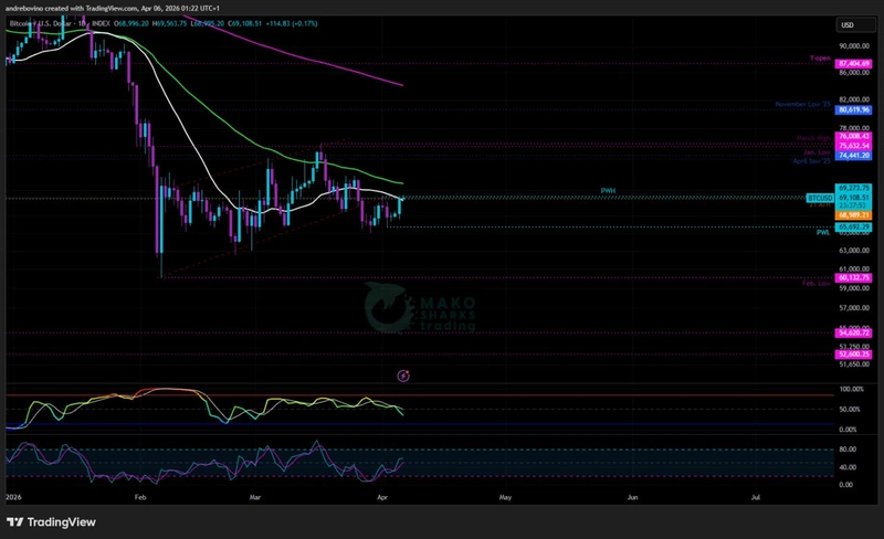 Нов месец, но същите цели! Влизаме в април почти без промени, като BTC все още е на тънък лед. Идеалният сценарий за мечките е да задържат BTC под дневната 21SMA 68,9k, 55EMA 70,9k и седмичната 200EMA 68,3k на базата на дневните затваряния през цялата седмица и да постигнат пробив под минимума от предходната седмица (PWL) 65,6k, което би създало нови проблеми за биковете и би компрометирало „хопиума“! От решаващо значение е да се постигне дневно затваряне под февруарското дъно от 60,1k, което би тласнало BTC към нови дъна. 💀 😒 😉