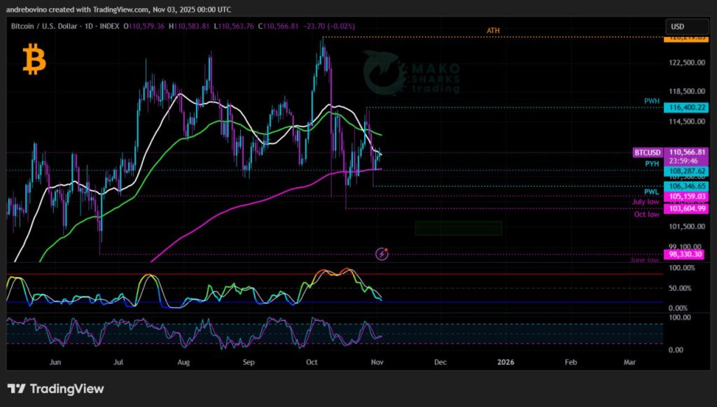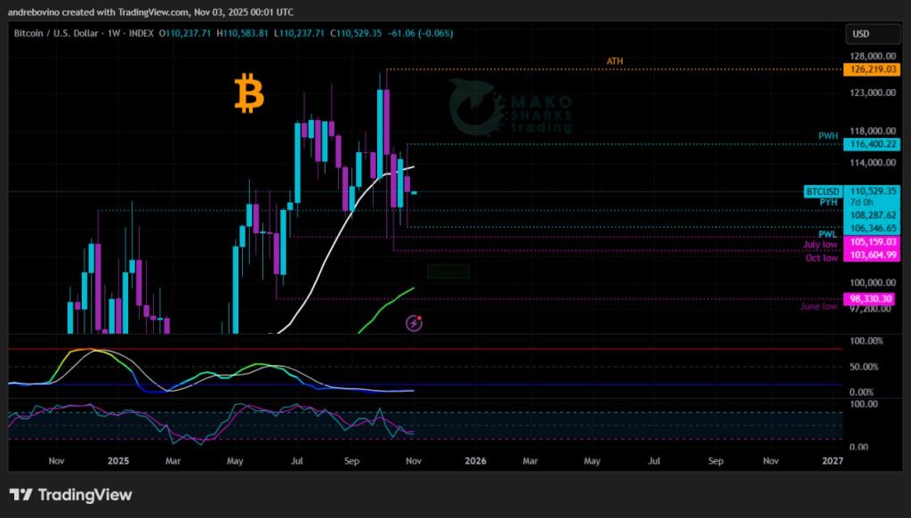 Биткойн започва седмицата си на ниво 110,5k! „UPtober“ приключи на червено с ценови диапазон от 21,83%, превръщайки се в един от най-фасциниращите месеци в историята на крипто пазара – от нов исторически връх до най-голямото ликвидационно събитие, наблюдавано някога! Въпреки това, Биткойн продължава своята „ping-pong“ консолидация, държейки крипто аудиторията в напрежение.
