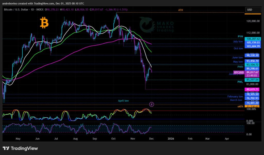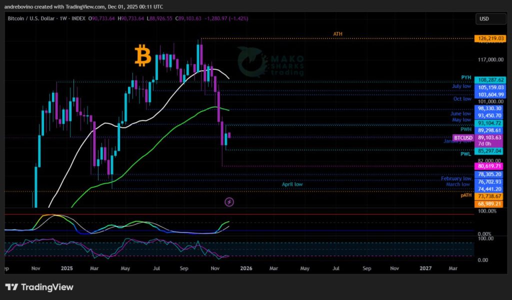 Първият сигнал, че мечият сценарий е застрашен, би бил повторното превземане на 98,3k заедно със седмичната 55EMA. За биковете критичната задача е защитата на Previous Week Low (PWL) на 85,2k при дневно затваряне. Провалът би изложил BTC на ретест на 80,6k, което едва ли ще издържи и може да доведе до спад към средните/високи 70k.