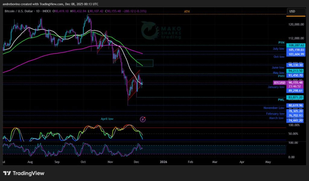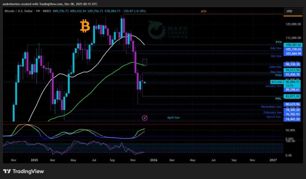 Идеално за Биковете този седмица е всяко успешно дневно затваряне над посочените нива (98,3k), което много вероятно ще отвори пътя към предизвикателство на PYH 108,2k, но за да започнат да възстановяват юнското дъно на 98,3k, Биковете имат нужда от успешно дневно затваряне над предходния високо ниво на седмицата (PWH) на 94,2k, като също така трябва да поддържат подкрепа от дневния и месечния 21SMA 87,9k, защото загубата на тях ще ги доведе до PWL 83,8k и тънък лед от ноемврийското дъно 80,6k. 🕊 🌩 🐈
