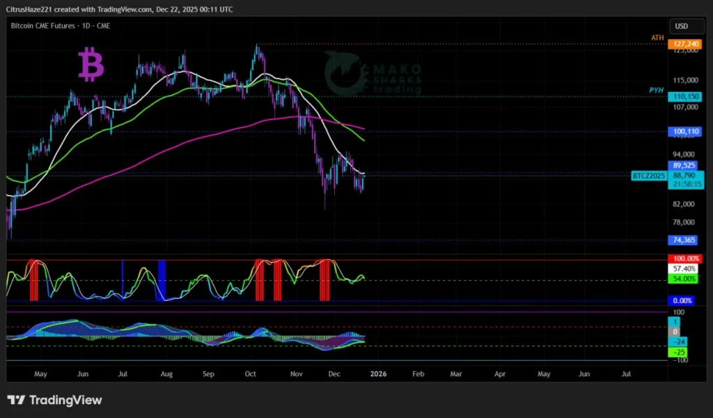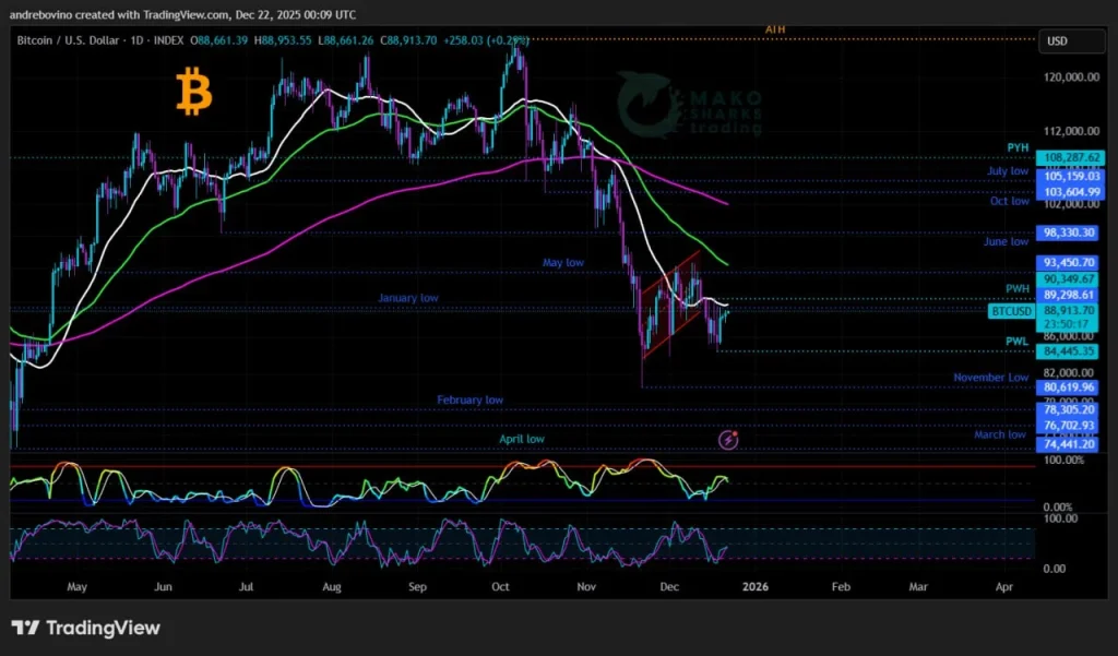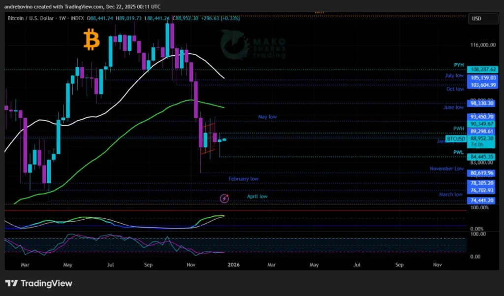 Биткойн започва седмицата с несигурност. Коледата наближава заедно с напрежението и въпроса дали празниците ще донесат Дядо Коледа или Гринч. Ще влезем ли в новата година над 90 хиляди или под 80 хиляди долара? Биткойн продължава да се консолидира и да се движи между слаба подкрепа и силна зона на съпротива. Диапазонът между върха и дъното от миналата седмица се стеснява, което подсказва, че това много вероятно е „седмица на решение“. 🧸 🕯 🚗