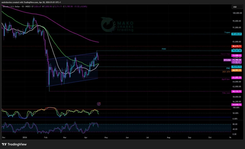 Bitcoin започва седмицата на ниво 73,8 хил.! Биковете имаха силна седмица зад гърба си, но истинското изпитание тепърва предстои. Последният ръст изтласка цената директно към седмичната 21-периодна пълзяща средна (21SMA), която действаше като съпротива и задържаше BTC в рамките на структурата на мечи флаг. „Оранжевият човек“ продължава да играе ключова роля с „преговорите“ си за TACO, към които пазарът остава изключително чувствителен. Цената в момента се търгува в диапазона 60 000–80 000, но множество фактори все още са в полза на мечките. Могат ли биковете да си възвърнат ключовите нива и да натиснат за разширяване над 80 000, или мечките отново ще се възползват от геополитическия шум? 🕊 😠 🔫