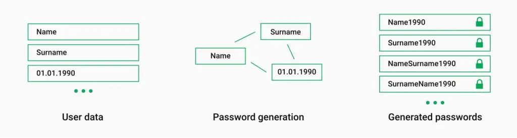 Въпреки че броят на хората, които използват прости или стандартни пароли като „password“, „qwerty“ или „123456“, намалява, мнозина все още обичат лесни и запомнящи се фрази. Те често включват имена на домашни любимци, любовници, любители на домашни любимци, бивши домашни любимци или нещо, свързано с действителната услуга, като например нейното име (с малки букви).