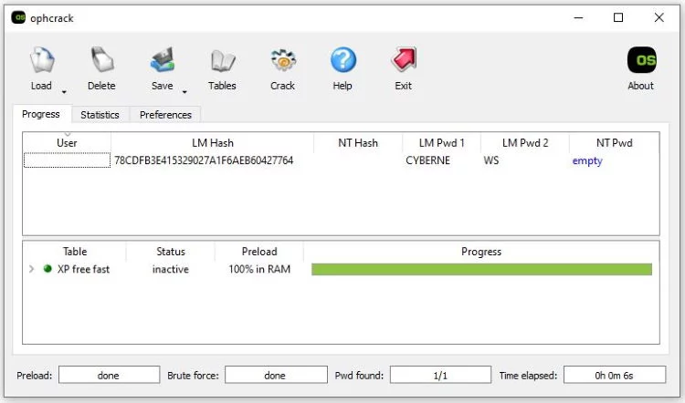 Както можете да видите на горната снимка, на Ophcrack му бяха необходими само шест секунди, за да разбие парола с 8 символа, като използва таблица с дъга, която включва букви, цифри и главни букви. Това е дори повече променливи, отколкото обикновено има една основна парола.