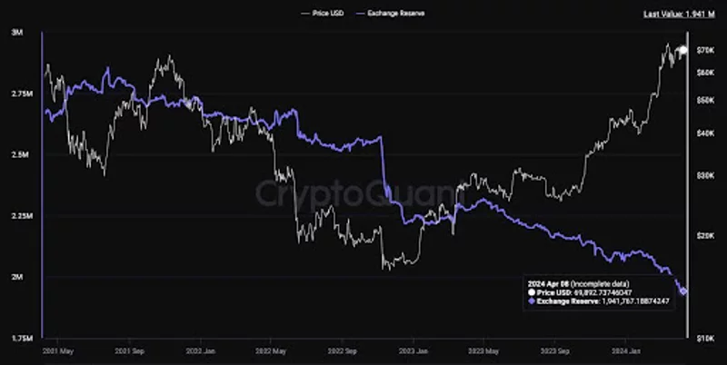 В първите дни на април пазарът на криптовалути стана свидетел на значителен етап, тъй като резервите на биткойн (BTC), държани от борсите, се сринаха до безпрецедентно ниски нива, като паднаха под 2 милиона BTC. Това развитие остави по-малко от 10% от общото предлагане на Биткойн в обращение на разположение на тези платформи. Подобно драстично намаляване на наличните резерви на Биткойн представлява сценарий, при който нарастването на търсенето може потенциално да доведе до забележимо свиване на предлагането.