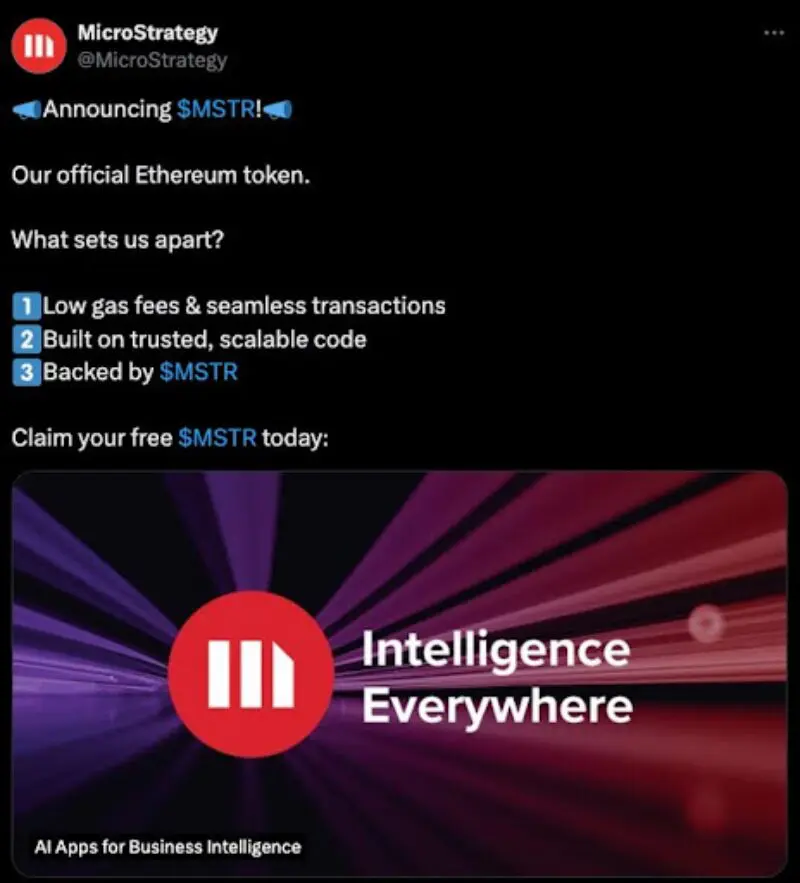 Официалният акаунт на MicroStrategy X наскоро стана жертва на хакерски инцидент, при който злонамерени лица поеха контрола и разпространиха поредица от вредни връзки, които уж предлагаха авиоликвидация на предполагаем токън MSTR, базиран на Ethereum. Този акаунт, свързан с известната фирма за бизнес разузнаване MicroStrategy, се превърна в проводник за популяризиране на измамна схема за аирдроп.