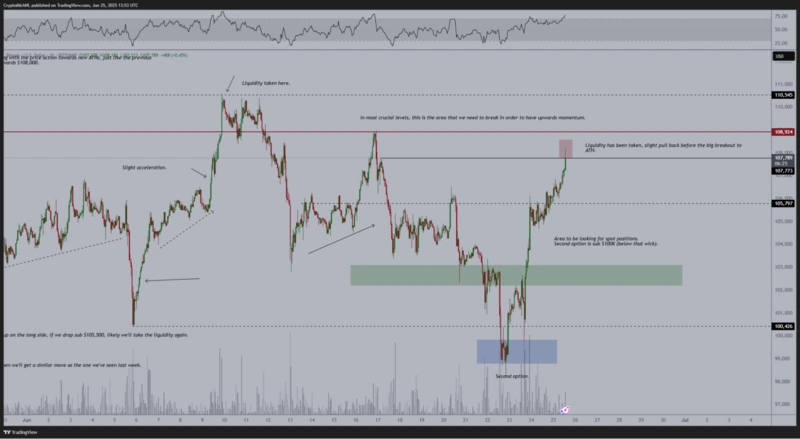 Ван де Попе посочи продължаващия възходящ импулс на Bitcoin, като предположи, че въпреки че може да има кратък период на странично движение, общата тенденция остава положителна. Той определи 108 900 долара като последната значителна съпротива, която трябва да бъде преодоляна, за да достигне Bitcoin нов рекорд. Според анализатора, Bitcoin вече е абсорбирал близката ликвидност, което обикновено сигнализира за началото на по-силен импулс. Ако тази тенденция продължи, той очаква Bitcoin да пробие тази съпротива в рамките на следващите няколко седмици, като потенциално постави нов рекорд до юли.