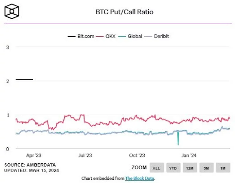Съотношението пут-опции към кол-опции под единица обикновено се тълкува като знак, че активността на кол-опциите надхвърля тази на пут-опциите, което предполага бичи настроения на пазара. Търговците, които купуват кол опции, обикновено са оптимистично настроени за посоката на пазара, докато тези, които купуват пут опции, се считат за мечи настроени. По данни на The Block понастоящем Deribit доминира на пазара на опции за биткойн, като е домакин на приблизително 90% от целия отворен интерес, а днешното съотношение пут-колл е регистрирано на ниво 0,58.