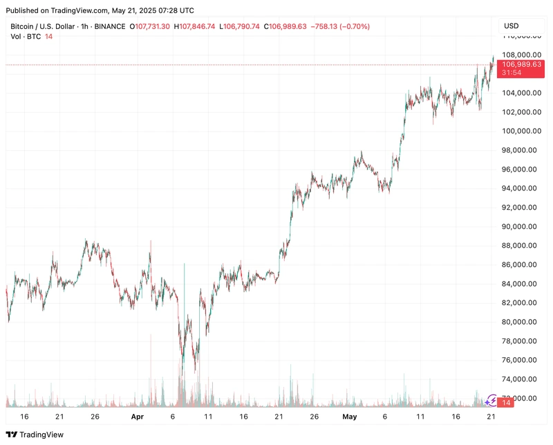 Bitcoin наскоро достигна нов връх от около 108 000 долара на 21 май 2025 г., което бележи ключов момент в продължаващото му рали. За разлика от резки и непредсказуеми скокове, това повишение отразява добре организирано и стабилно възходящо движение, движено от истинска пазарна сила.