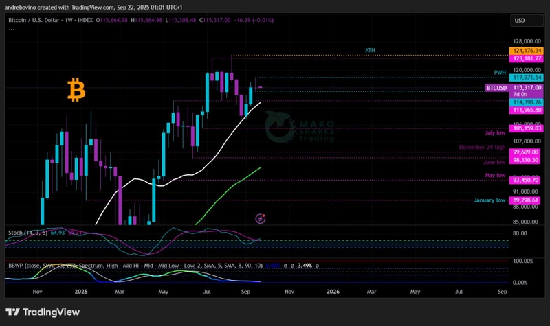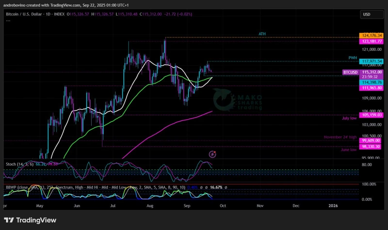 Биткойн започва седмицата при 115,3k! Търговията под 120k продължава да държи участниците на пазара в несигурност – дали бичките имат сила да предизвикат ново рали или мечките ще постигнат краткосрочна победа с потенциална капан, но едно е сигурно – с намаляването на диапазона PWH/PWL изглежда, че тази седмица може най-накрая да донесе яснота! 🟢 ⏳ 🔴
