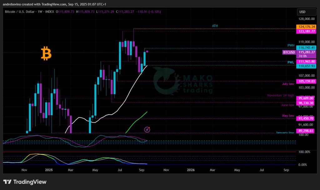 Биткойн започва седмицата на 115,4k, след като миналата седмица улови известно бичо настроение и разпали въображението на крипто общността, макар че все още остава в рамките на по-нисък връх спрямо 117,4k! Ще успеят ли Биковете да задържат Мечките при потенциални корекции и да разгорят този нов импулс за продължение и „атака“ към тестване на историческия връх? 🛡 😳 ⛔️