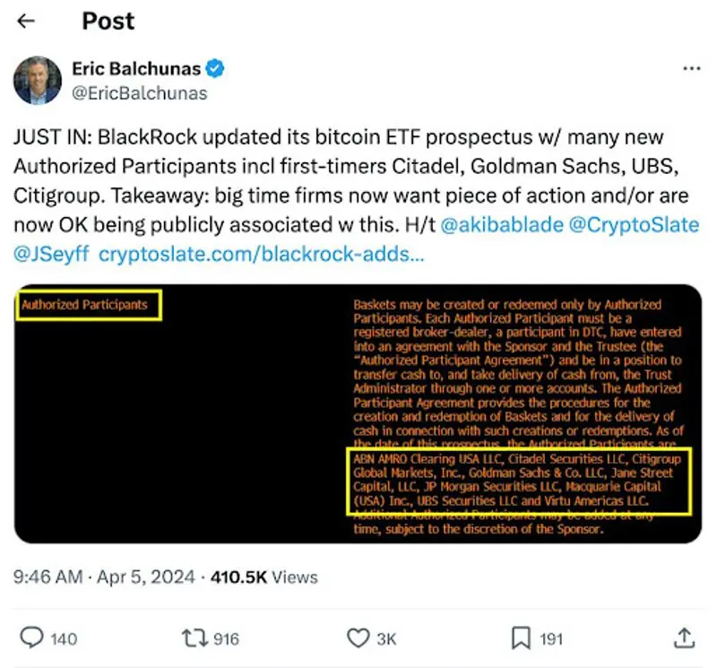 Тези нови попълнения в списъка на участниците в ETF са ABN AMRO Clearing, Citadel Securities, Citigroup Global Markets, Goldman Sachs и UBS Securities. Тази актуализация беше направена официално чрез изменение на регистрационната декларация S-1 на BlackRock, подадена в Комисията по ценни книжа и фондови борси на САЩ (SEC).