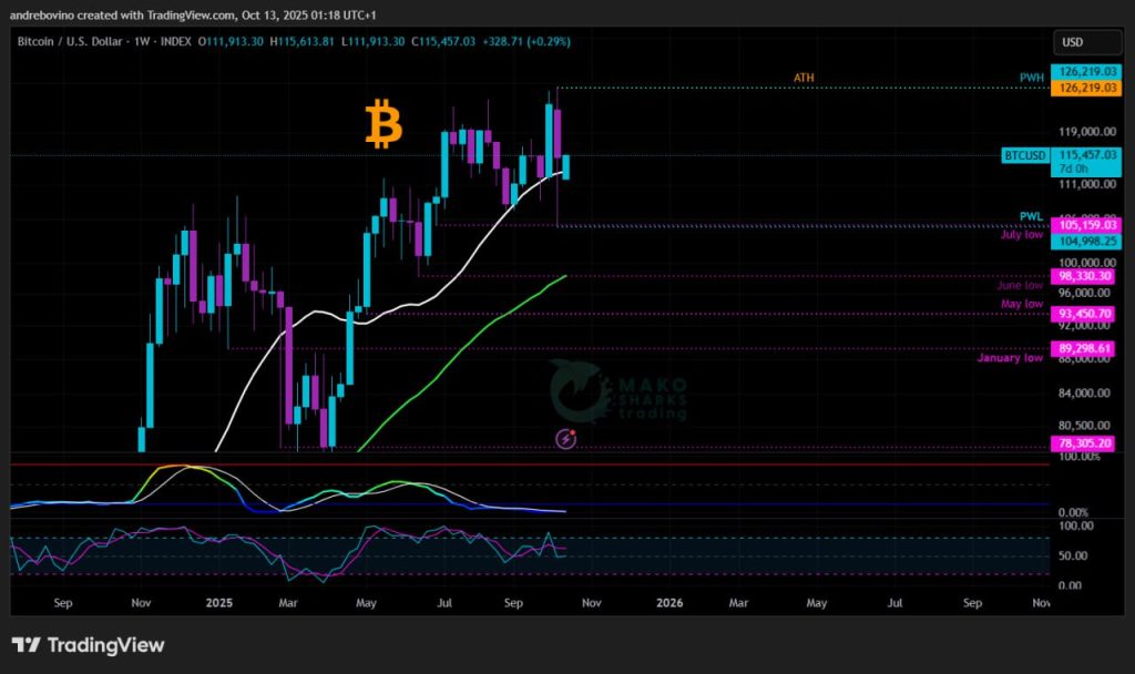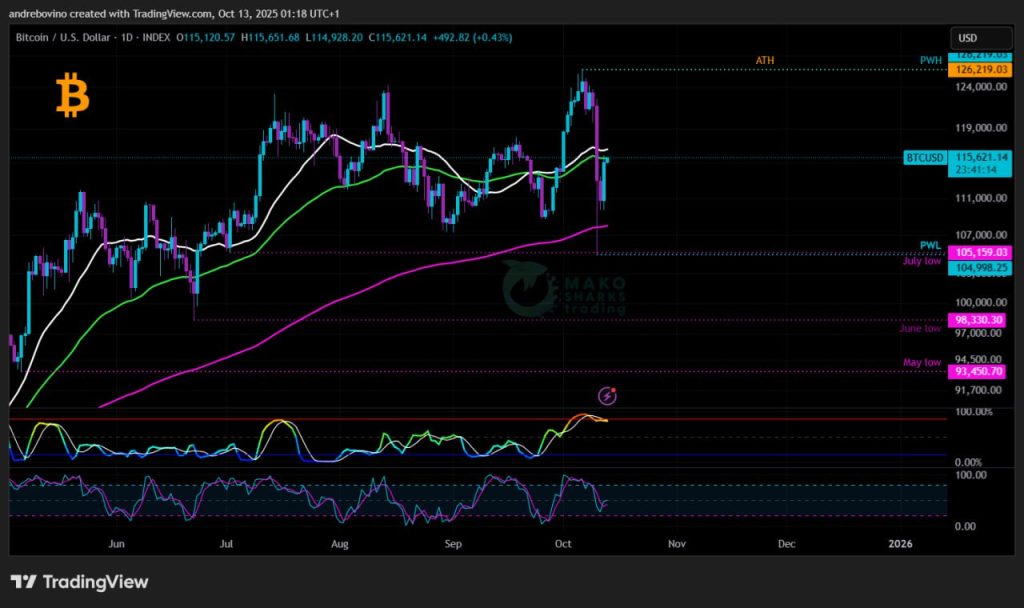 Биткойн започва седмицата на 115,1k след едно от най-диваците движения този цикъл с 17/20% спад в зависимост от борсата и масивна ликвидация от 19,14k B, която изтри не само презапасените бичове, но и нетърпеливите мечки. От чиста еуфория до суров страх за няколко дни, пазарът сега е на кръстопът. Ще могат ли бичовете да задържат ключовата зона от 100k и да възстановят импулса, или мечките ще нанесат решителния удар, който ще постави следващия голям преход? 🌩 😈 🔪