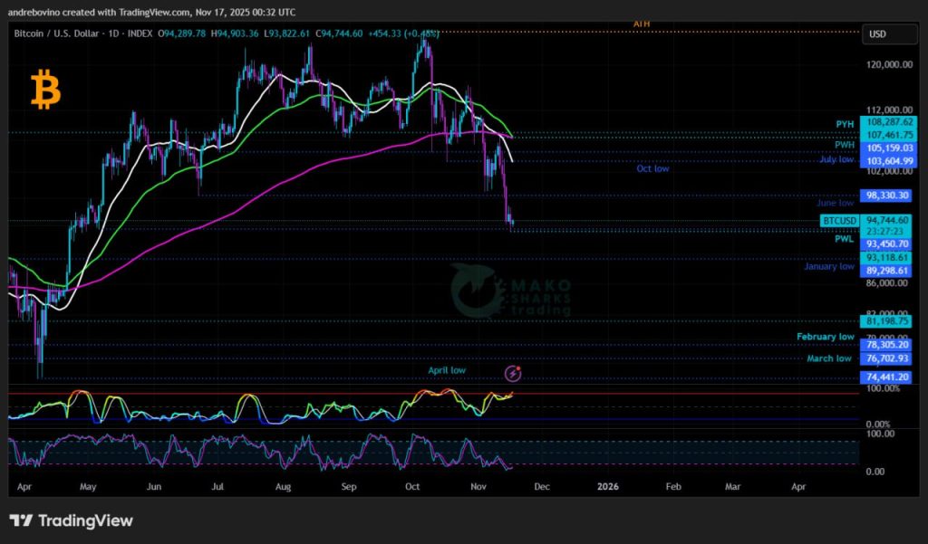 Биткойн започва седмицата на 94,2k! Предстоящата реакция от тази критична зона ще бъде решаваща за определяне на следващото голямо направление на Биткойн и основният въпрос остава: Могат ли биковете отново да разпламтят искрата на надеждата и да върнат оптимизма на крипто пазара или мечките ще потвърдят своето доминиране и ще натиснат цената още по-ниско?! Този момент или ще маркира началото на по-голяма фаза на акумулация, която ще постави основите на потенциално възстановяване, или ще сигнализира за продължение на по-дълбок корективен ход. 📉 🕯 😴