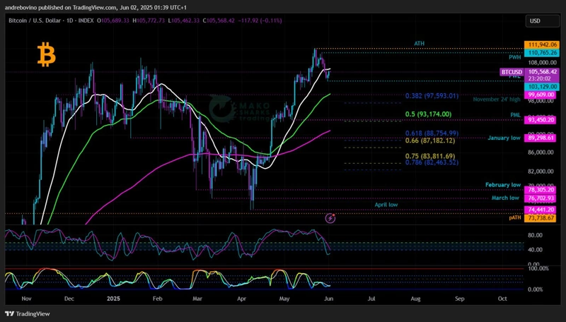 Биковете са в малко по-неблагоприятна позиция в краткосрочен план. За да възвърне възходящия импулс, Bitcoin трябва да си върне дневната 21SMA 106,3k и да търси разширяване към PWH 110,7k, където е от решаващо значение да се осигури дневно затваряне през седмицата над тази нива или в идеалния случай над ATH 111,9k, което би изтласкало Bitcoin обратно в неизследвана територия!