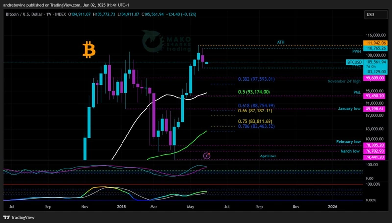 Bitcoin стартира новата седмица на 105,6k, движейки се между ключови зони, докато биковете и мечките се борят за краткосрочен контрол. След леко отстъпление от неотдавнашния ATH, биковете се нуждаят от дневно затваряне над PWH 110,7k, за да възвърнат инерцията, докато мечките се стремят към спад под 100k, за да предизвикат продължителна корекция. И двете страни са близо до важни пивотни точки, което прави тази седмица потенциално решаваща. Ще възвърнат ли биковете доминацията си или мечките ще забавят и ще заглушат Hopium. 🐂 🥊 🐻