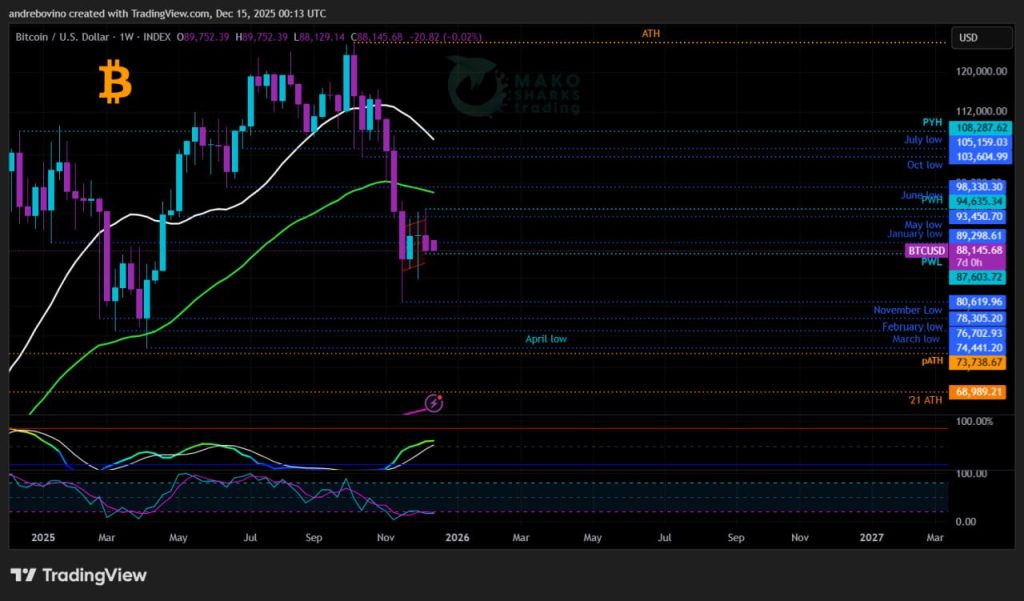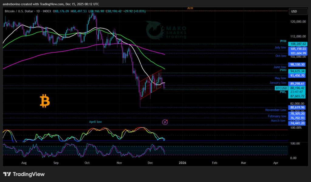 Биткойн започва седмицата на ниво 88,2k! Все още не усещаме мириса на Коледа и канела във въздуха, но новото дъно започва да мирише. Мечките бавно изгасват хипа и Хопиум, докато се носят над криптовселената на крилете на Назгулите, докато бичовете стоят на тънък лед и се надяват да защитят месечния 21SMA на 87,6k и ноемврийското дъно на 80,6k. Остава ли още надежда за Хопиум, или Гринчът идва, за да коронова мечките в края на годината? 🚗 🍭 🎩
