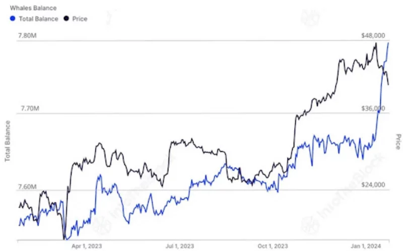 „Докато биткойн ETF-ите отбелязаха нетни притоци от 820 млн. долара, биткойн китовете отбелязаха увеличение от ~3 млрд. долара (76 000 BTC) досега през 2024 г.“, заяви IntoTheBlock в седмичния си бюлетин. „Китовете включват всяко юридическо лице, физическо лице или фонд (включително ETFs), които притежават над 1 000 BTC“.