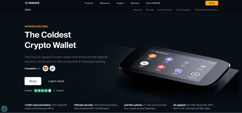 | NGRAVE ZERO | Сигурен портфейл за съхранение на студено | EAL7 сертификат, air-gapped, защитен от манипулации | 4000+ активи | 398 $ | Най-висока сигурност, биометрична автентификация | Частично |