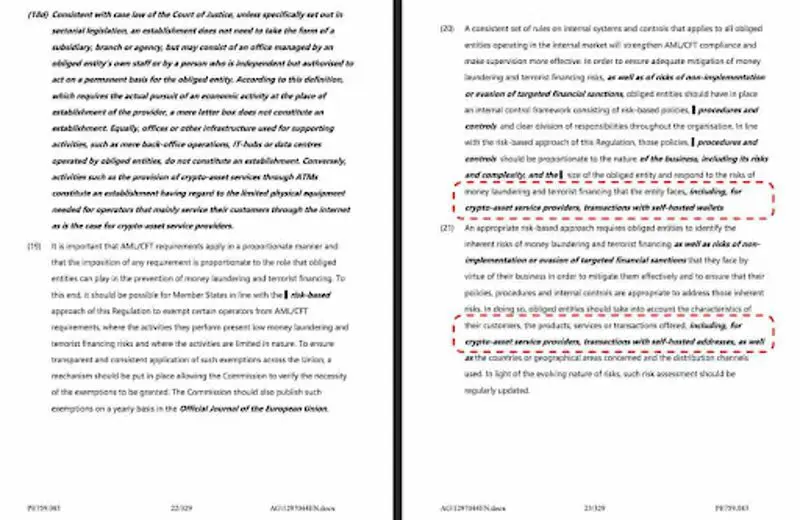 В неотдавнашно значимо регулаторно развитие в рамките на Европейския съюз (ЕС) беше взето решение за въвеждане на забрана на транзакциите с криптовалути, насочени към „хоствани портфейли“ от анонимни крипто портфейли, които се съхраняват сами. Този ход е важна част от нововъведения на континента набор от разпоредби за борба с изпирането на пари (AML). Главната комисия на Парламента на ЕС даде одобрението си за тази забрана на 19 март – решение, споделено от Патрик Брейер чрез публикация.