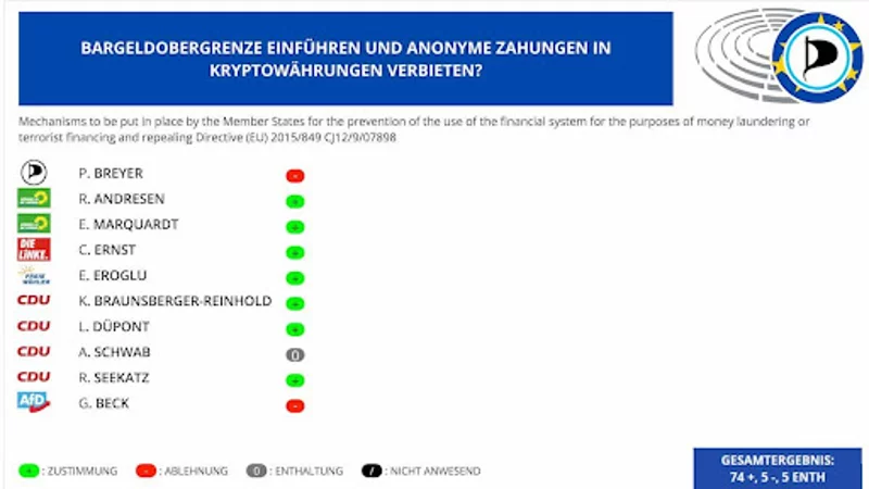 Резултати от гласуването във водещата комисия на Европейския парламент за борба с изпирането на пари. Източник: Piraten Partei