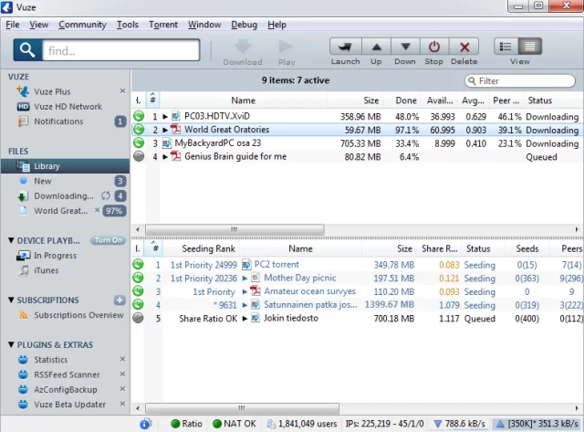 • Vuze – Vuze е елегантен торент клиент с най-добре изглеждащия интерфейс от всички P2P клиенти. Той е лесен за използване, интуитивен и има функции, включително чат, форуми, дистанционно управление и поддръжка на магнитни връзки. Ако изберете платената версия, ще получите дори защита от вируси и никакви реклами.