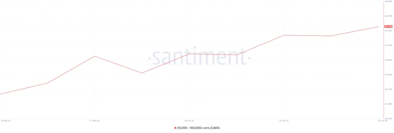 Нативният токен на PancakeSwap, CAKE, беше един от най-предпочитаните от крипто китовете през първата седмица на юни. Адресите на китовете, притежаващи между 10 и 100 милиона CAKE токена, са закупили 710 000 токена през този период, според Santiment.