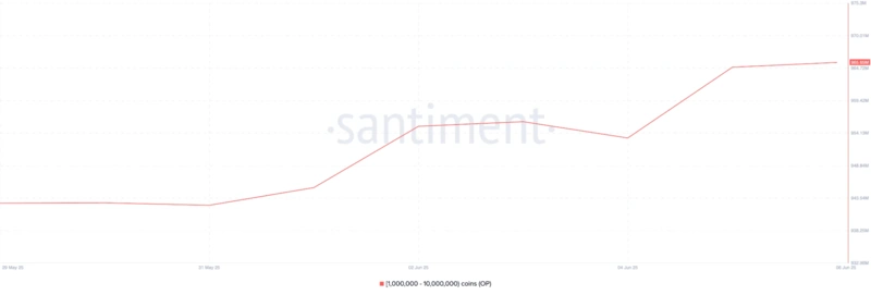 Optimism (OP), алткойн от Layer-2, също привлече значителен интерес от китовете през този период. Данните от веригата показват, че китовете, притежаващи между 1 и 10 милиона токена, са добавили 17 милиона OP токена през последната седмица.