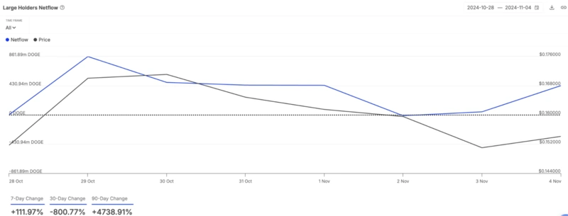 Dogecoin (DOGE), една от водещите мем монети, също отбеляза значителна активност от страна на крипто китовете тази седмица. Това е видно от 112% увеличение на нетния поток на големите притежатели през последните седем дни.