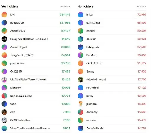 Стойността на акциите, която е показателна за вероятността за резултат „да“ или „не“, отразява волатилността, наблюдавана на криптопазара. Понастоящем цената на акция „Да“ е 0,84 щатски долара, докато цената на акция „Не“ е 0,20 щатски долара. Известен участник, използващ псевдонима „kiwi“, притежава акции „Yes“ на стойност приблизително 440 000 щатски долара. Обратно, водещият притежател на „Не“ има инвестиция от едва около 15 000 USD.