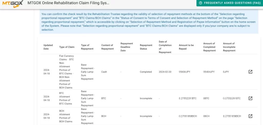 Един от кредиторите сподели екранна снимка, илюстрираща, че сметките за вземания на Mt. Gox вече включват таблица, показваща статуса на погасяване, завършените погасявания и висящите погасявания.