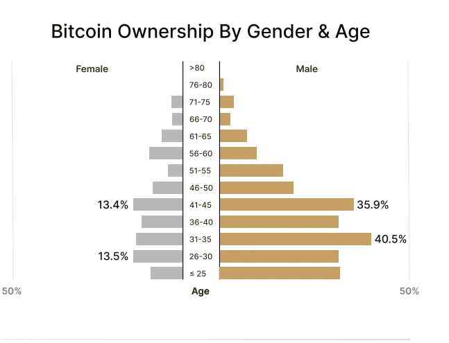 Притежаването на Bitcoin преминава социалните и политическите граници с малки разлики въз основа на раса, религия, доходи или политическа принадлежност. Въпреки това, той е значително по-популярен сред мъжете и по-младите възрастни. Най-голямата група собственици на Bitcoin са мъже на възраст от 31 до 35 години, които съставляват 40,5% от притежателите, следвани от мъже на възраст от 41 до 45 години с 35,9%. Жените представляват само 13,4% от собствениците, което подчертава значителната разлика между половете в приемането на криптовалутите.