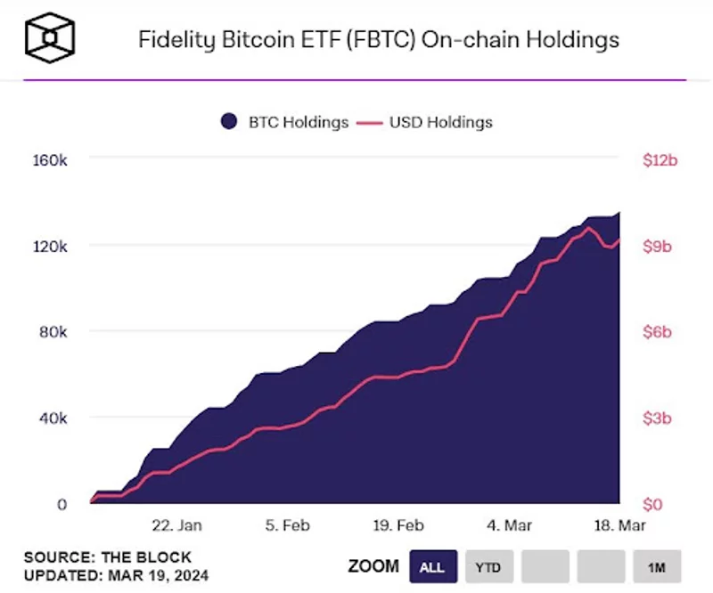 След одобрението на своя спот биткойн ETF през януари, Fidelity успешно акумулира впечатляващите 132 570 биткойна, което означава стойност на активите над 9 млрд. долара, отбелязвайки първото си начинание в сферата на спот продуктите за търговия с криптовалути на борсата.