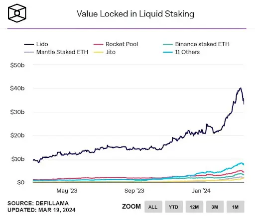 Една от водещите структури в тази област, Lido, понастоящем наблюдава операциите по залагане на етери на стойност приблизително 35 млрд. долара, което подчертава значителния мащаб на дейностите по залагане в рамките на мрежата Ethereum.