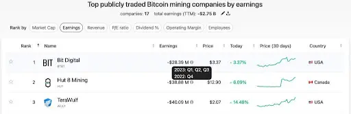 Bit Digital (NASDAQ: BTBT) се откроява като „най-печелившата“ публично търгувана компания за добив на биткойни. Забележително е, че неговата нетна печалба от отрицателни 28,39 млн. долара от четвъртото тримесечие на 2022 г. насам води списъка, като BTBT притежава пазарна капитализация от 300 млн. долара.
