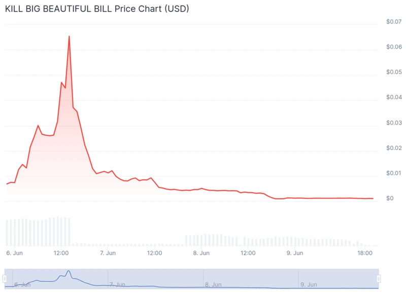 Подобно на това, токенът MELANIA отбеляза спад от 13%. Нова мемкоин, наречена KILL BIG BEAUTIFUL BILL (KBBB), отбеляза краткосрочен скок, преди да се срине с над 98%.