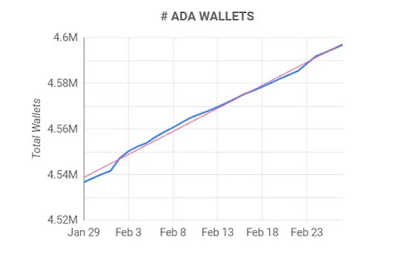 Данните, получени от Cardano Blockchain Insights, разкриват забележителен скок от почти 90% в създаването на портфейли от 22 до 23 февруари, като броят им се е увеличил от 1706 на 3227. Въпреки че оттогава темпът на растеж леко се е забавил, общата траектория остава положителна, като общият брой на портфейлите наближава 4,6 милиона.