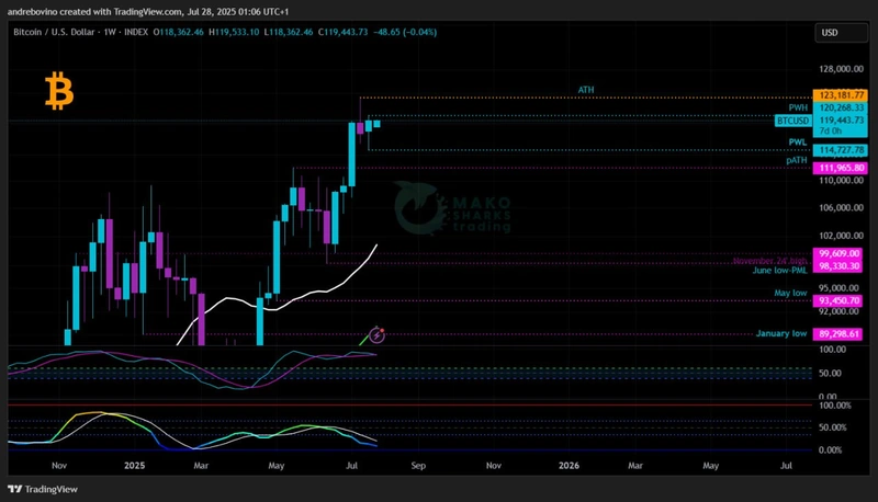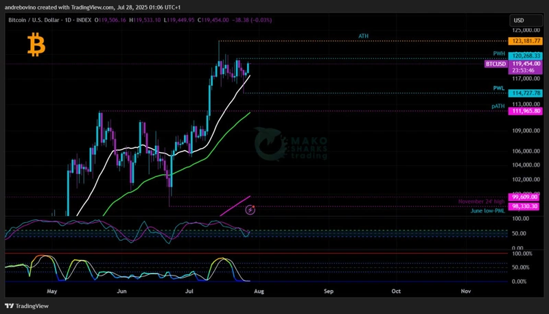 Биткойн започва новата седмица на 119 400 $, след като изминалите две седмици виси около ATH 123 100 $. Цената се движи в тесен диапазон от 5–6 k и след лек спад намери реакция при дневната 21-SMA. Тази седмица се очаква възможен пробив и нов ATH!