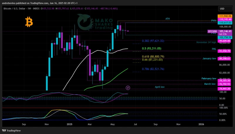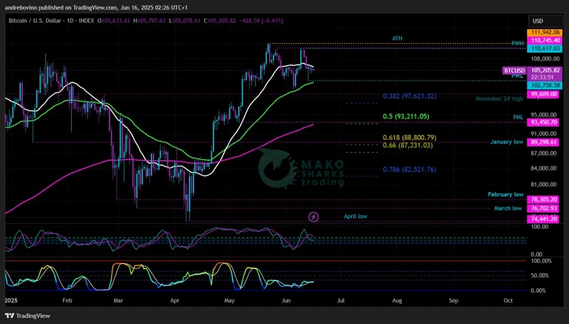 Bitcoin стартира новата седмица на 105,5k След спада от 110k миналата седмица, Bitcoin оставя отворен въпроса дали ще успее да защити подкрепата от 100k въпреки „размахването на саби“ и ескалиращия конфликт между Иран и Израел, или мечките ще се възползват от ситуацията и ще смъкнат цената в зоната от 90k? 📞 💀 😇