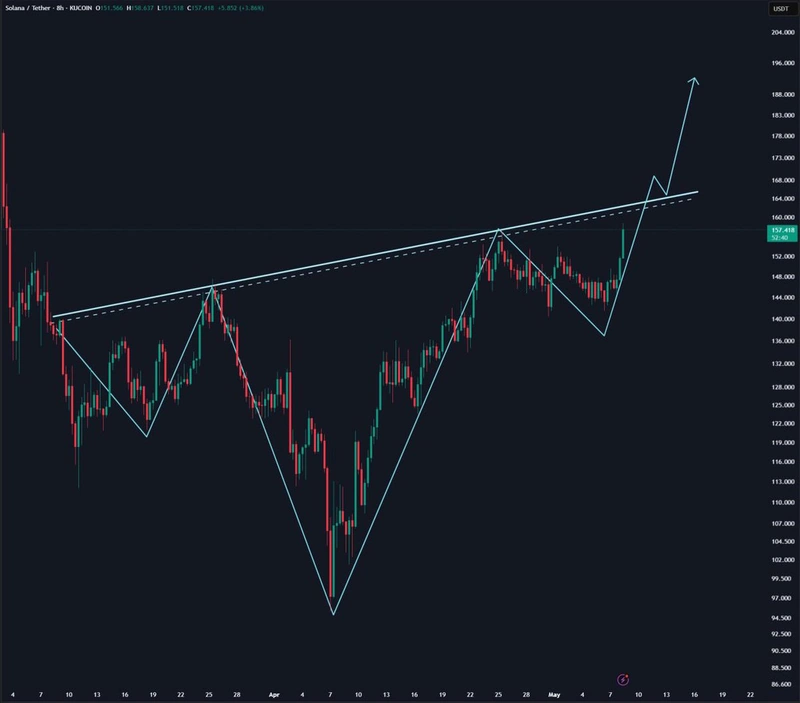 Техническите анализатори следят отблизо ценовите графики на Solana, където се очертава добре оформена формация „обратна глава и рамене“. Тази класическа формация на графиката често се разглежда като знак за предстоящ пробив. Ключовото ниво на съпротива – или „линията на врата“ – е около 160 долара, което Solana наскоро премина и сега се опитва да задържи като подкрепа.