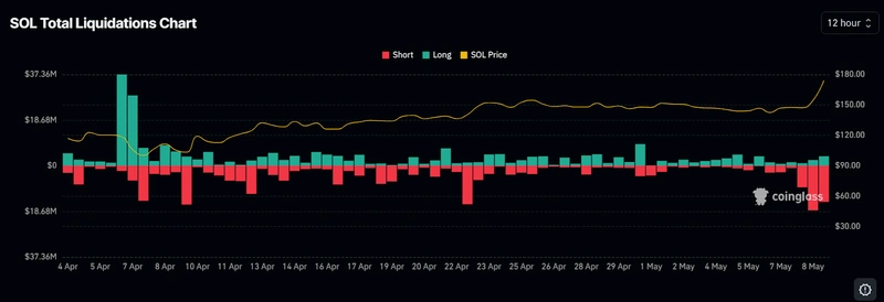 След скока в цената на Solana, за само няколко дни бяха изтрити къси позиции на стойност над 30 млн. долара. Само на 8 май бяха ликвидирани къси позиции на стойност над 18 млн. долара, което изтласка цената още по-нагоре, тъй като тези трейдъри бяха принудени да купуват обратно.