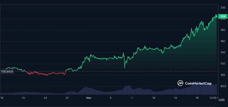 Представянето на токена в по-близките времеви рамки е също толкова впечатляващо. През последния месец Solana е нараснала с 88,86%, а през последната седмица може да се похвали с 40,30% увеличение. Само за последните 24 часа стойността му се е повишила с още 7,64%, което е довело до 208,01 долара към момента на изготвяне на доклада.