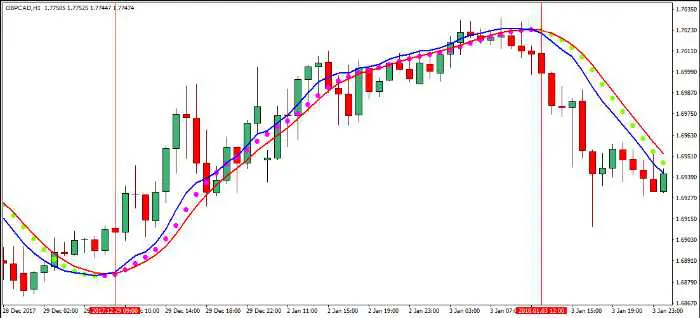 Трейдърите обикновено използват две МА с различна продължителност. Текущата тенденция може да се обърне, когато по-късата средна стойност пресече по-дългата, което ще накара търговците на импулси да затворят позиции.