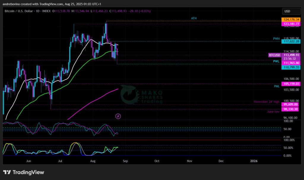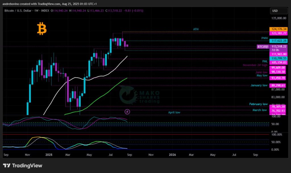 За съжаление бикoвете отслабнаха малко и Биткойн докосна под 111,9k, което увеличава вероятността за спад към PML 105,1k, дневната 200EMA на 103,9k и седмичната 21SMA на 105,2k, въпреки че това не означава, че Hopium е изчезнал! Долната/средна зона около 100k е идеална за по-малка консолидация и потенциален нов тласък към нов ATH.